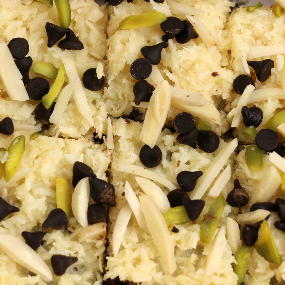 پایه این شیرینی مغذی، یک براونی غنی از شکلات تلخ و مخلفات شیرینی است. این شالوده خوش‌رنگ قهوه‌ای، یک پایه خوشمزه را برای لایه‌های بالا فراهم می‌کند. لایه میانی،‌ یک حال شیرین را با ترکیب پودر نارگیل آماده می‌کند. در نهایت، لایه رویی مخلوطی دلپذیر از خلال بادام، خلال پسته و چیپس شکلات است. این ترکیب یک تردی لذت‌بخش و طعم‌های چندگانه‌ای را می‌آفریند. این رویه رنگی هیجان پر جنب و جوشی را برایت به ارمغان می‌آورد.